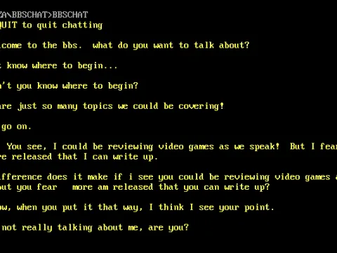 As a piece of software, it inverts the typical dynamic seen in later interactive characters. Here, the computer actively questions the player, rather than the player interrogating a character. The variety in each session stems from the different personal revelations users are led to provide, often while under the temporary belief they are communicating with a person.