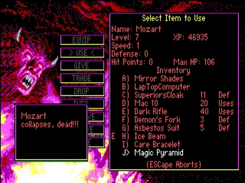 The gameplay involves forming a party by recruiting companions from among Hell's inhabitants, many of whom are famous historical or fictional personalities. Interactions with various characters, both friendly and hostile, are a central activity. While the setting is a horror premise, the tone is frequently comedic, evidenced by humorous dialogue and whimsically named equipment.