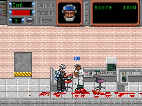 Movement includes walking in four directions and jumping, with progression typically dependent on locating keycards to unlock exits. Opposition comes from soldiers, while scientists present no threat. The game emphasizes violent combat, with defeated enemies dismembering into gory pieces and bloodstains persisting in the environment.