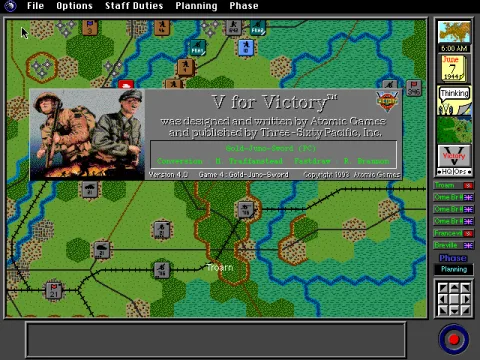 V for Victory: Gold-Juno-Sword is a game set during the Normandy landings. Players can assume command of either the commonwealth forces or the German army, with each side pursuing opposing strategic objectives.