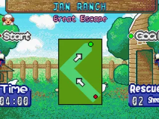 Sheep for the Game Boy Advance is a real-time puzzle game where the player, controlling a sheep dog, must herd groups of sheep into a truck before time expires. The core herding mechanics involve moving near sheep to push them away, navigating obstacles, and avoiding hazards. Additional canine abilities include barking to motivate the flock, carrying individual sheep, and laying down treats to create a path for them to follow.