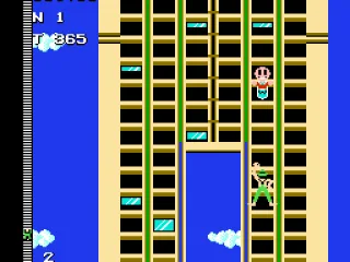 A time-based bonus system is in place. After each successful helicopter evacuation, a bonus score is awarded. This bonus decreases for every ten seconds spent climbing that particular building. Occasionally, a Lucky Balloon appears, which can carry the climber up approximately ten stories and also increases the player's bonus score.