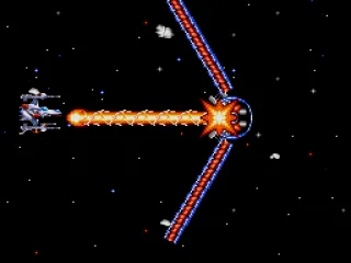 A selection of weapon enhancements can be acquired during play. These include plasma-based attacks, lasers, and missiles. The defining mechanical element is a flexible armament system, allowing the player to reconfigure powered-up weapons to suit immediate threats. This enables firing patterns such as focused spreads or directional shots oriented vertically or horizontally.