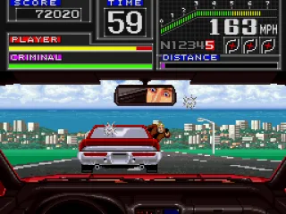 Upon successfully completing a stage, a statistics screen evaluates performance based on remaining time, inflicted damage, and turbo usage, awarding points accordingly. The game incorporates a configurable speedometer and presents narrative elements between rounds, framing the high-speed pursuits.